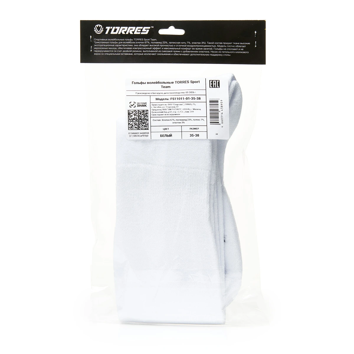 !Гольфы волейб. TORRES Sport Team, FS11011-01-35-38, р.35-38, БЕЛ, хлопок, полиамид, латекс,эластан