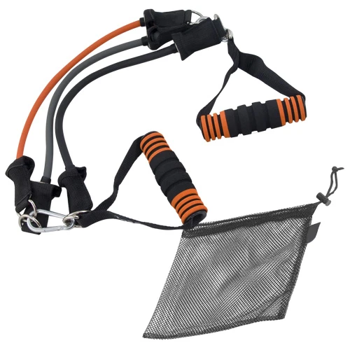 В зависимости от уровня физической подготовки и характера упражнений сопротивление эспандера регулируется за счет трех съемных латексных шнуров разного сечения (9, 10 и 11 мм) в диапазоне от 1 до 12 кг. Длина жгутов 42 см.