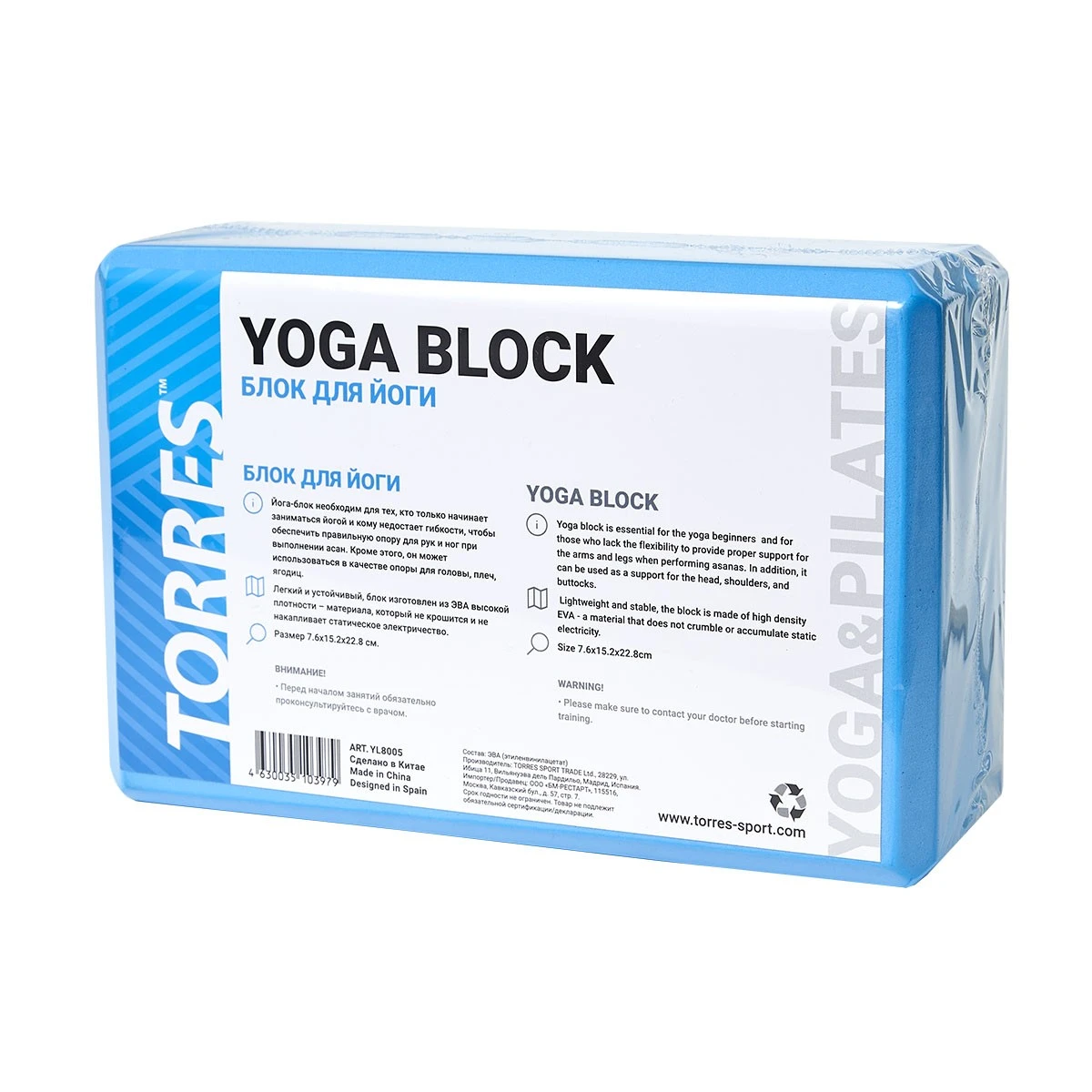Блок для йоги TORRES, YL8005, размер 8x15x23 см, материал ЭВА, голубой