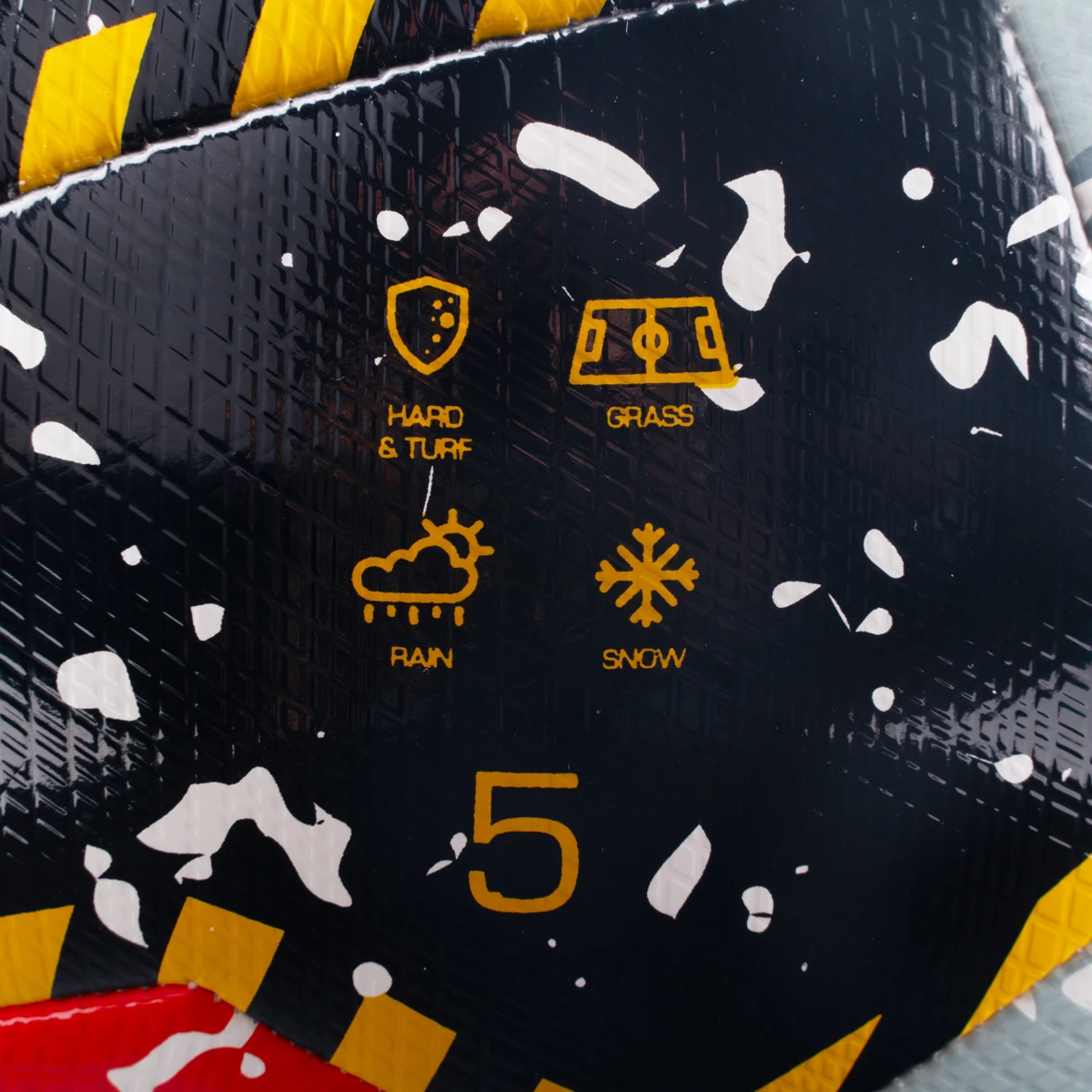 Мягкий полиуретан толщиной 0.7 мм на тканой основе со структурированной поверхностью,значительно улучшает сцепление между мячом, бутсами и перчатками, способствует лучшей передаче силы удара. Слой высокотехнологичной 2-мм сверхмягкой пены, ламинированный 4мя слоями прочной ткани с использованием латексного клея, делает мяч мягким и износостойким. Резиновая камера с бутиловым ниппелем.