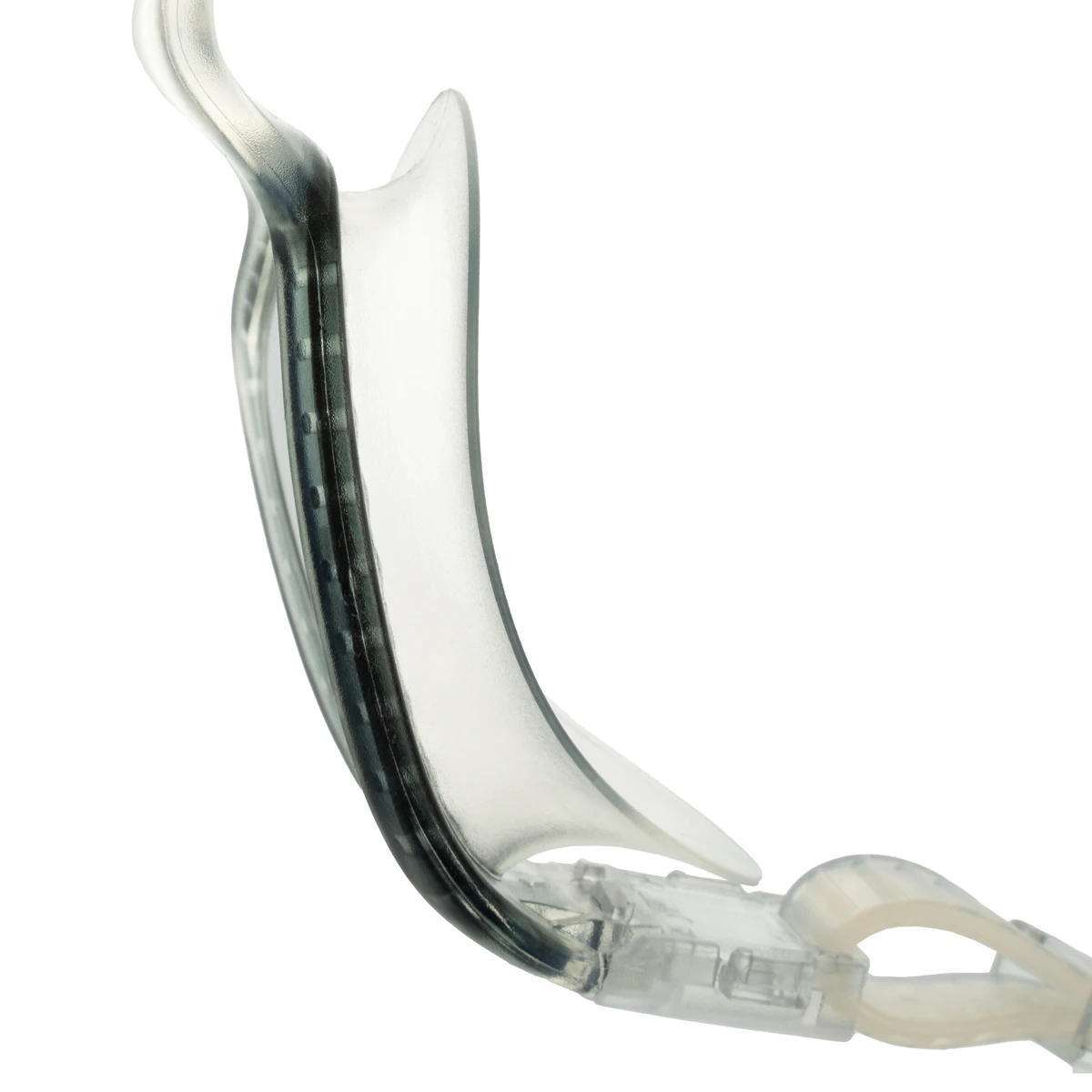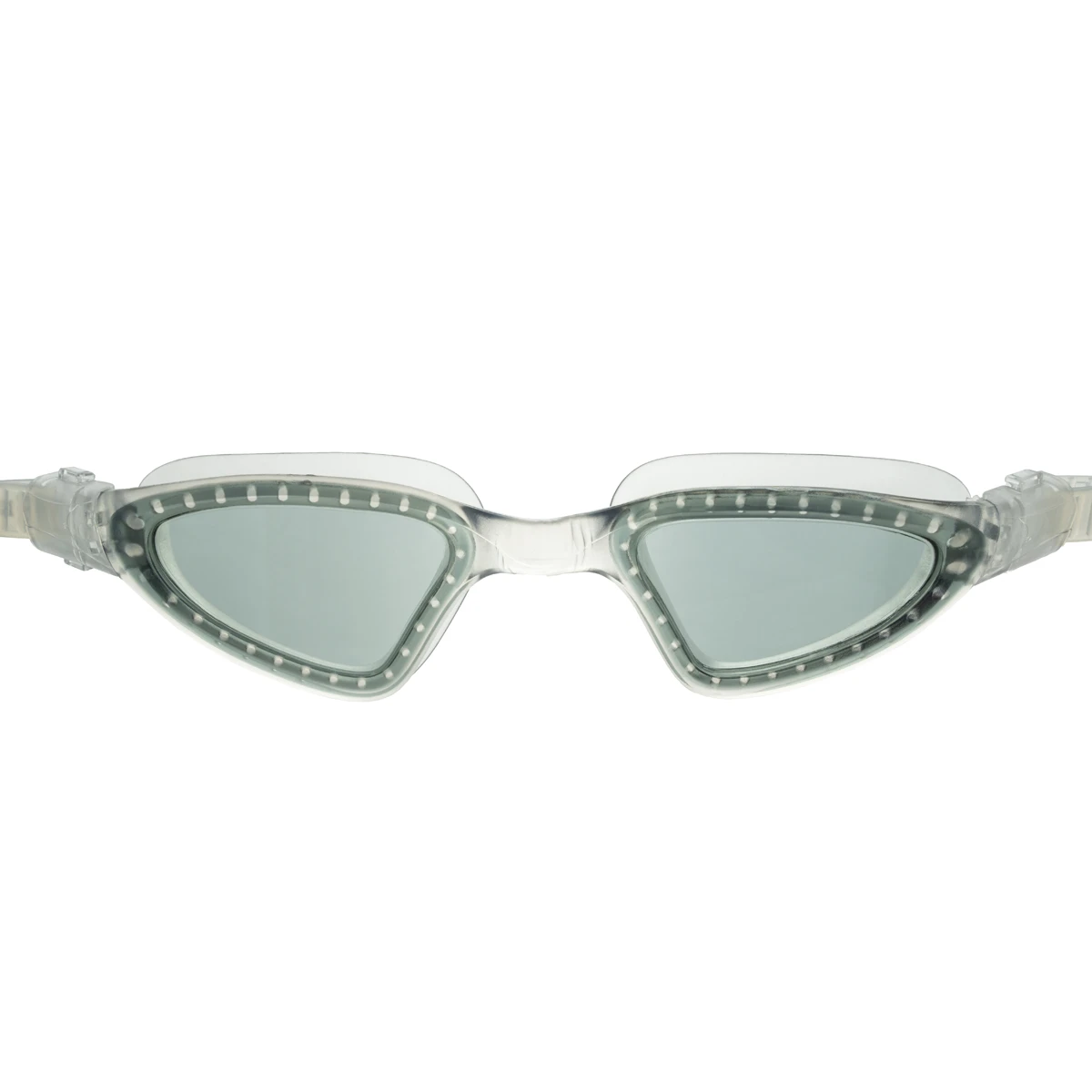 Эффектная форма и элегантное цветовое решение в сочетании с максимальным комфортом - то что нужно для достижения высоких результатов. Полупрозрачные линзы из поликарбоната обработаны специальным составом предотвращающим запотевание, а так же надежно защищают от ультрафиолета. Раздвоенный силиконовый ремешок регулируется по бокам и настраивается на любой объем.