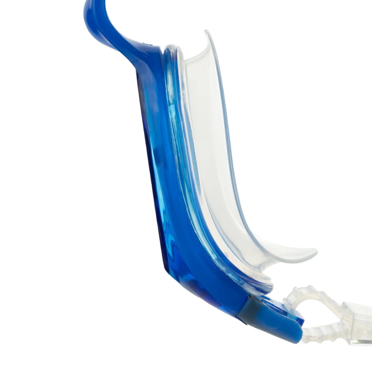 Уплотнитель и ремешок выполнены из так называемого жидкого силикона, обеспечивающего исключительный комфорт пловцам. Широкие линзы из поликарбоната обеспечивают широкий обзор и обработаны специальным составом предотвращающим запотевание. Синий цвет линз защищает глаза от яркого света, снижает общую яркость без значительного искажения цветов. Защита от ультрафиолета дает возможность использовать очки для плавания на открытой воде и при ярком освещении. Двойной, регулируемый по бокам ремешок из силикона.