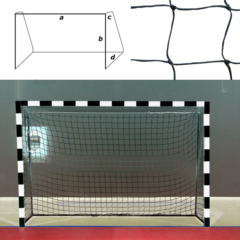 Сетка гандб./футзал, по форме ворот, размер a:3.0 b:2.0 c:0.8 d:1.0 м, нить 3,5 мм полипропилен (ПП), ячейка 10*10 см., цвет черный. Кромки сетки обработаны оверлоком. Шнур для крепления в комплекте.