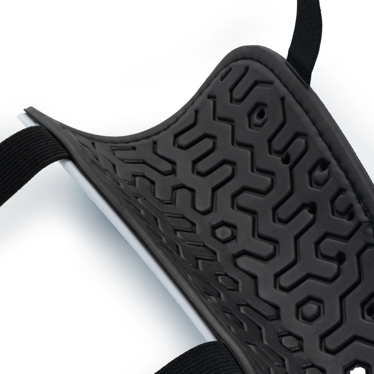 Внешняя поверхность щитка выполнена из высокопрочного пластика, внутренняя подкладка из структурированной синтетической пены (ЭВА) толщиной 5 мм. Тисненый рисунок на внутренней поверхности ЭВА, не только создает дополнительную вентиляцию и комфорт, но и способствует лучшему поглощению (рассеиванию) силы удара. Отверстия в пластике и внутренней подкладке для вентиляции, две эластичных застежки на липучке (застегиваются сбоку). Без голеностопа.