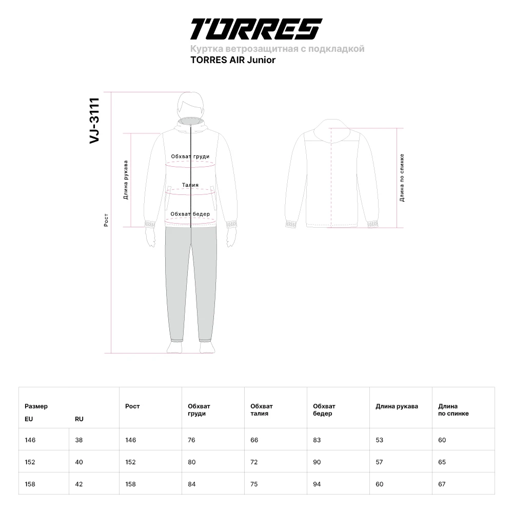 Краткое наименованиеКуртка ветрозащитная с подкладкой TORRES AIR Junior, Размер 146 см