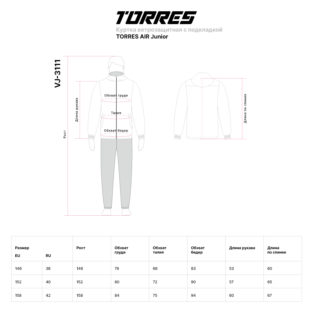 Краткое наименованиеКуртка ветрозащитная с подкладкой TORRES AIR Junior, Размер 152 см