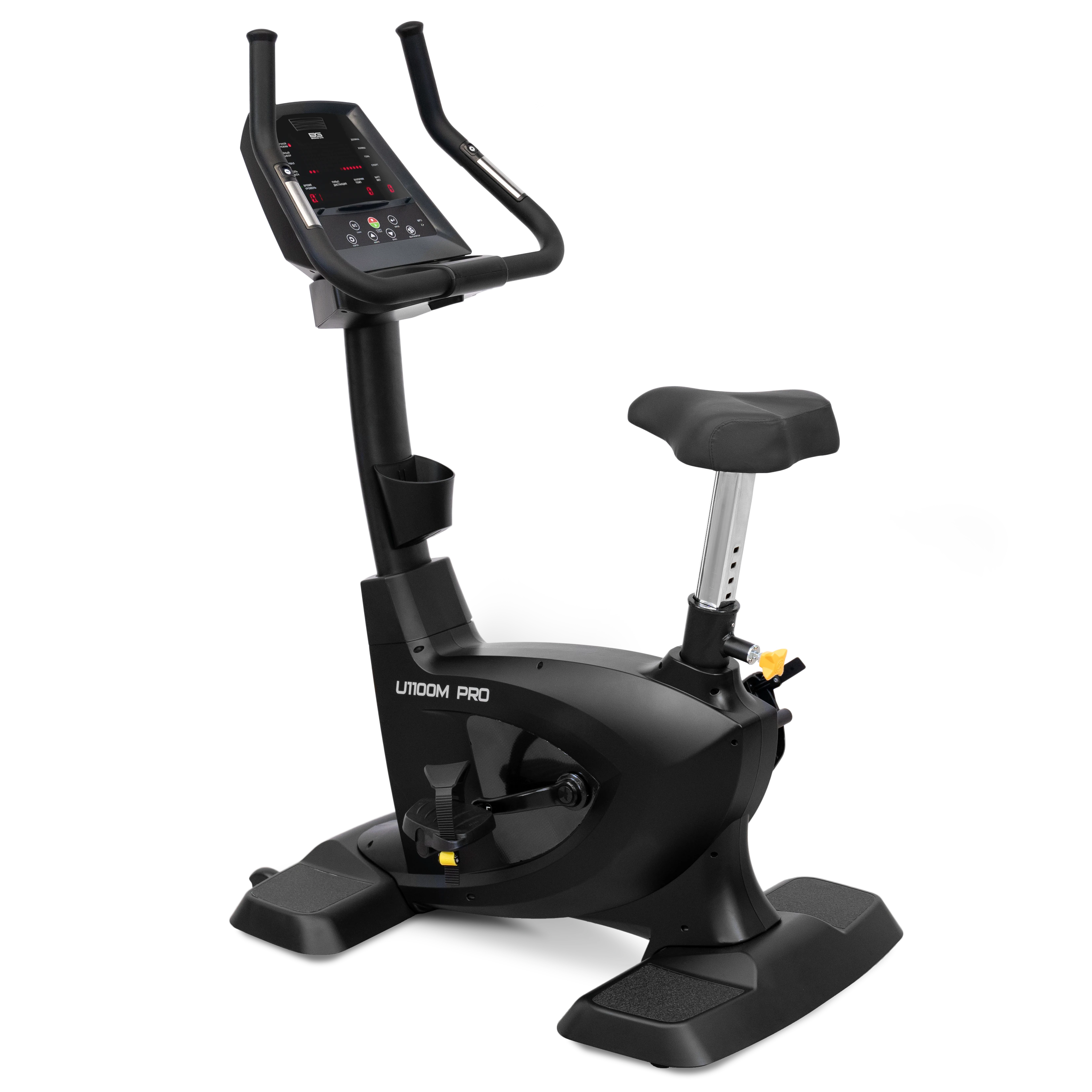 U1100M PRO – это велоэргометр с вертикальной посадкой коммерческого класса, предназначенный для использования в крупных премиальных и бюджетных фитнес клубах. Тренажер, как и подобает профессиональному уровню, оборудован лучшими техническими характеристиками. На U1100M достигнуты оптимальные биомеханические свойства. Велотренажер оснащен электромагнитной системой нагружения с генератором (GMS). В основе маховик с инерционным весом, эквивалентным 18 кг. Сиденье широкое и мягкое, регулируется по вертикали под любой рост пользователя. На базе педального узла литой трехкомпонентный шатун на подшипниках. Сами педали широкие, рассчитаны на любой размер ноги и фиксируются специальными регулируемыми ремешками. Кроме того, они покрыты специальным антискользящим рельефом. Велотренажер весьма тяжелый – 69 кг и выдерживает нагрузку до 180 кг включительно. Оборудование поставляется в упаковке из гофрированного картона.