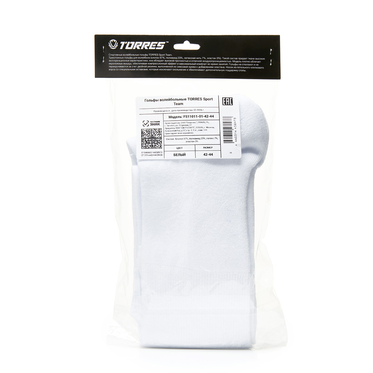 !Гольфы волейб. TORRES Sport Team, FS11011-01-42-44, р.42-44, БЕЛ, хлопок, полиамид, латекс,эластан